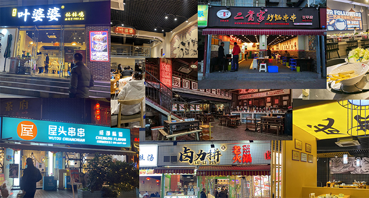 在成都,品深團(tuán)隊(duì)先后實(shí)地走訪了鋼管廠五區(qū)小郡肝、花嘴巴、馬路邊邊、洪七公、九街淑芬、二當(dāng)家等知名的串串火鍋。為了更好的感受串串火鍋現(xiàn)場(chǎng)消費(fèi)特點(diǎn),我們特意選擇周日餐飲旺時(shí),周一餐飲閑時(shí)在門(mén)店蹲守觀察。