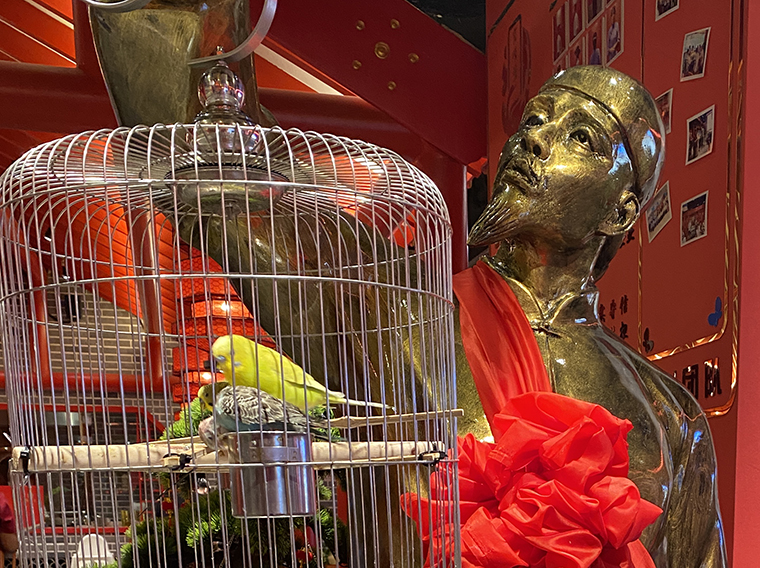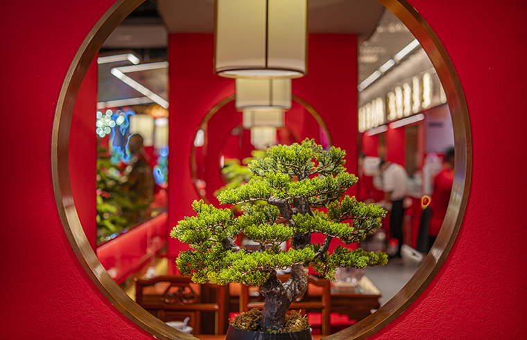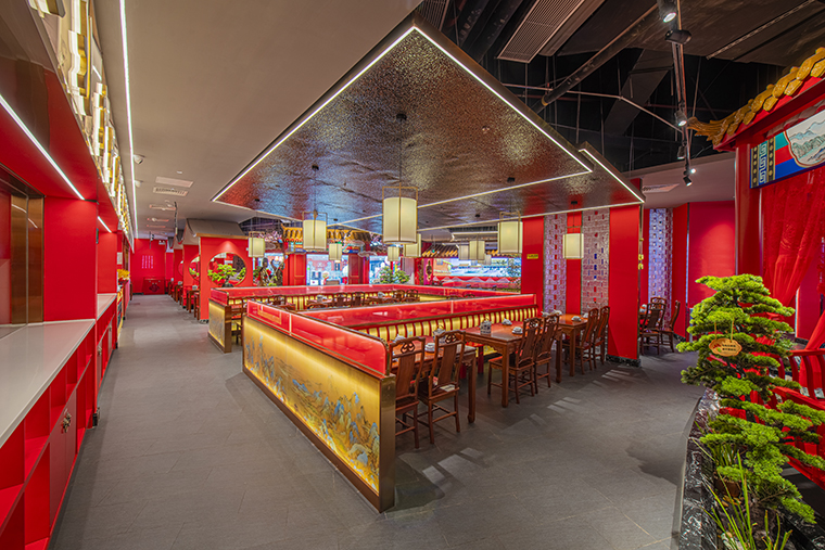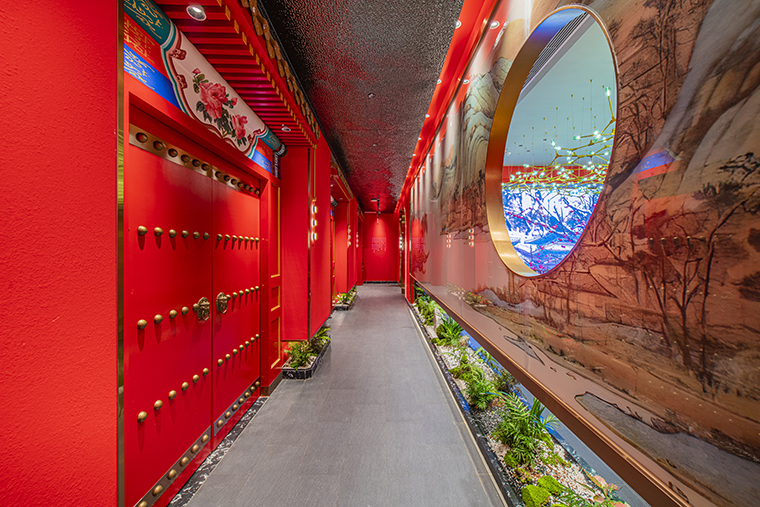 京味張的空間裝飾設計大量借鑒了中式園林造景手法,一步一小景、三步一大景,步移景異。用中國紅強化品牌內含的北京皇城文化,令人印象鮮明;門口的迎賓人,提籠遛鳥人,跑堂人等雕塑銅人將老北京烤鴨飲食文化自然帶出;中式園林造景手法,點綴綠植,水景,框景,步移景異;天花的不銹鋼波紋板,一朵朵的祥云裝飾;矮隔斷的千里江山中國山水工筆畫造型裝飾,仿佛流動的山水國畫;立面的水晶玻璃磚,暗藏燈帶的玻璃隔斷,空間中各種不銹鋼收邊條,明檔上的不銹鋼背發光字,現代裝飾材料與經典美食交相輝映,經典不失時尚。