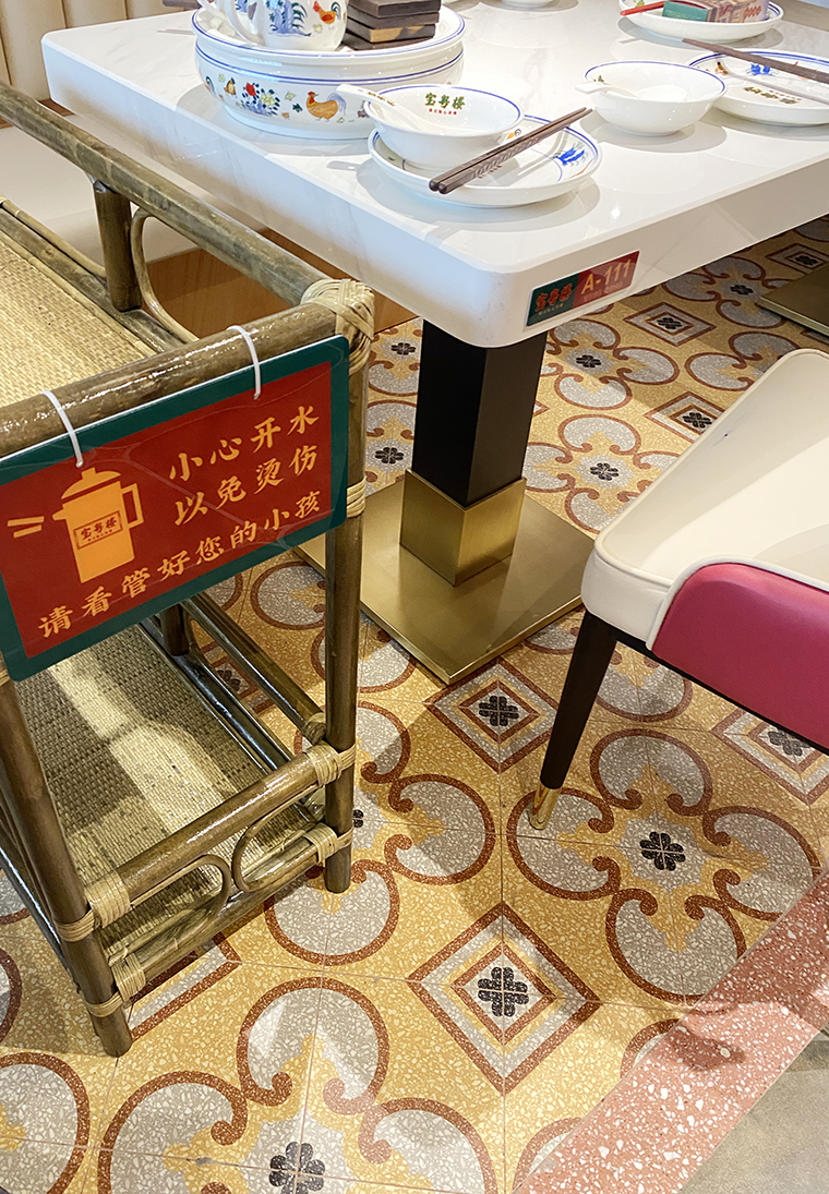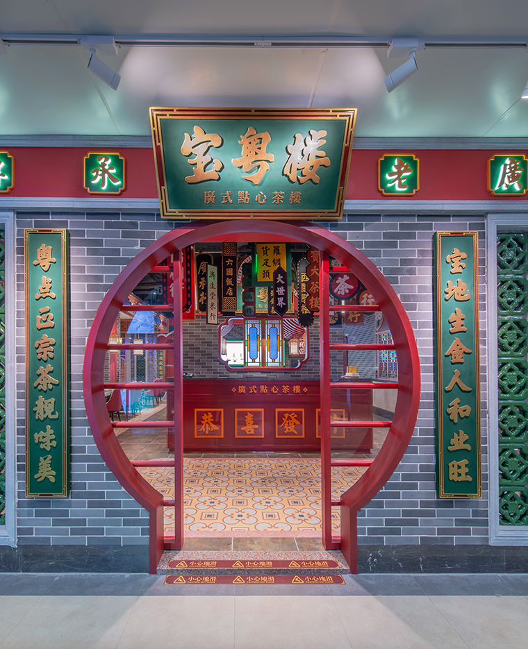 廣式花窗,又稱為滿洲窗。源自于廣州最開始與外國開展海外貿易,是典型的舶來品。滿洲窗不同的款式和花紋組合體現了使用者的生活富足與審美情趣。廣式花窗可以很好的表現廣式點心茶樓的品類屬性,具有一目了然,一見如故的特性。在寶粵樓的空間設計中,我們將廣式花窗大面積使用門口兩側的主形象,包房隔斷、甚至天花吊頂上,形成了強烈的視覺沖擊力,具有鮮明的老廣州西關韻味。