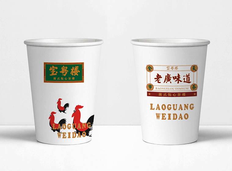 其他的VI如店內日常運營的物料系統,導視系統,推廣廣告系統,品深餐飲設計團隊力圖整體空間與品牌完整統一,精細到連顧客接觸最多的墊餐紙、點餐單、使用的功夫茶具、員工的工衣胸牌、圖片的風格,全部統一在寶粵樓的品牌文化體系之內,給顧客以視覺整齊劃一又靚麗多變的美學感受。