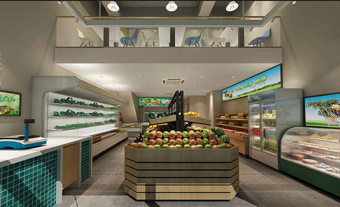 確定了品牌形象,我們開始啟動空間形象設計。菜菜公社的首家店位于西麗德意名居,這個小區(qū)靠近地鐵7號線西麗湖站,小區(qū)入住率非常高,消費人群比較高端。菜菜公社的定位是高品質(zhì)生鮮,我們的空間形象核心就是在滿足生鮮店各項功能基礎上,塑造高品質(zhì),互動體驗的特色。