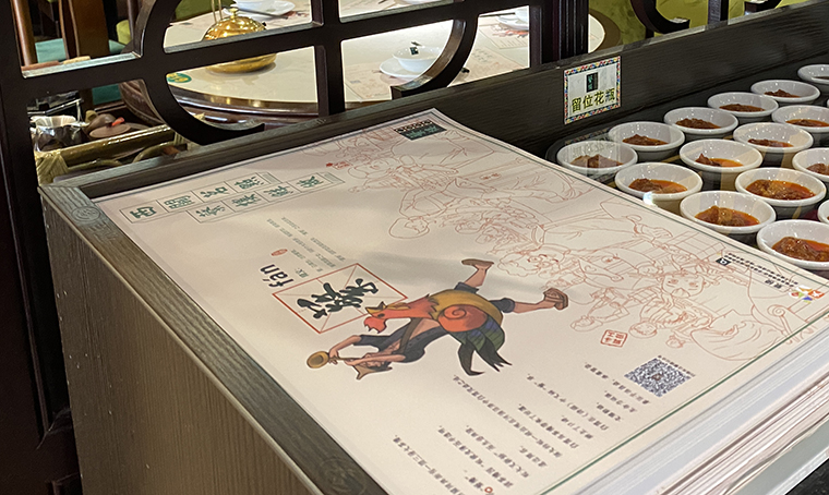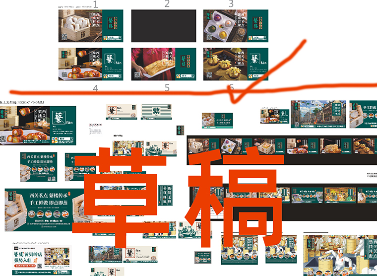 此次海報(bào)設(shè)計(jì)有六個(gè)連續(xù)畫(huà)面,正好適合推廣明星款產(chǎn)品。因蘩樓的產(chǎn)品本身就有較強(qiáng)的藝術(shù)美感及傳頌效果,綜合店長(zhǎng)及蘩樓主廚師建議,我們選取了6款產(chǎn)品來(lái)作為本次海報(bào)主題畫(huà)面,每一款海報(bào)主推一款明星產(chǎn)品,以連續(xù)陣列式畫(huà)面排開(kāi),顧客路過(guò)通過(guò)6個(gè)重復(fù)品牌畫(huà)面+強(qiáng)調(diào)明星產(chǎn)品的形式,視覺(jué)震撼,很容易形成對(duì)蘩樓的品牌記憶。