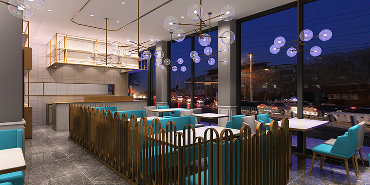 港灣茶餐廳內部裝飾盡量簡潔為主,沒有繁復的線條,整裝護墻板采用高級灰,時尚感強,藍綠色的招牌外觀,純鐵藝格柵,金色鍍銅架,整體氛圍休閑時尚,富有網紅特質。