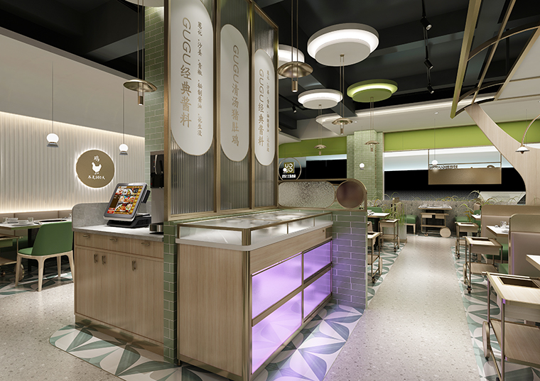 廣式火鍋因其健康養(yǎng)生、清淡滋補(bǔ)營(yíng)養(yǎng)好而深受各地消費(fèi)者的喜愛(ài)和追捧。除了傳統(tǒng)的潮汕鮮切牛肉火鍋,椰子雞、豬肚雞也是目前廣式火鍋中非常熱門的餐飲品類。深圳椰子雞火鍋連鎖品牌——江南春天椰子雞餐廳就非??春秘i肚雞這一品類,該連鎖餐廳旗下豬肚雞火鍋品牌——咕咕豬肚雞,將傳統(tǒng)的濃湯豬肚雞升級(jí)為清湯豬肚雞,湯底更加清淳,味道鮮香還甜美,相比傳統(tǒng)豬肚雞,養(yǎng)生滋補(bǔ)功效很明顯。咕咕豬肚雞餐廳在產(chǎn)品上還加入了粵菜經(jīng)典細(xì)分品類——啫啫煲,這也是粵菜中非常熱門的品類。與豬肚雞火鍋搭配,豐富了產(chǎn)品線,市場(chǎng)競(jìng)爭(zhēng)優(yōu)勢(shì)比較顯著。此次咕咕豬肚雞啫啫煲餐廳經(jīng)過(guò)認(rèn)真考察分析比對(duì)后委托品深餐飲設(shè)計(jì)負(fù)責(zé)咕咕豬肚雞啫啫煲大浪商業(yè)中心后浪新天地店的空間裝飾設(shè)計(jì)。