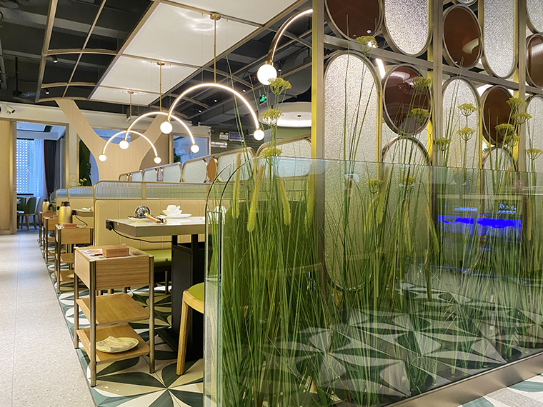 我們想到了磨砂玻璃這一材質(zhì),在餐廳立面的隔斷、包間的墻體,我們使用了磨砂玻璃及玻璃方磚,這種材料在燈光照耀下,有一種晶瑩剔透的感覺(jué),用裝飾材料特性表現(xiàn)菜品清湯這一核心特征,打造出時(shí)尚清新,通透舒適的空間感受。