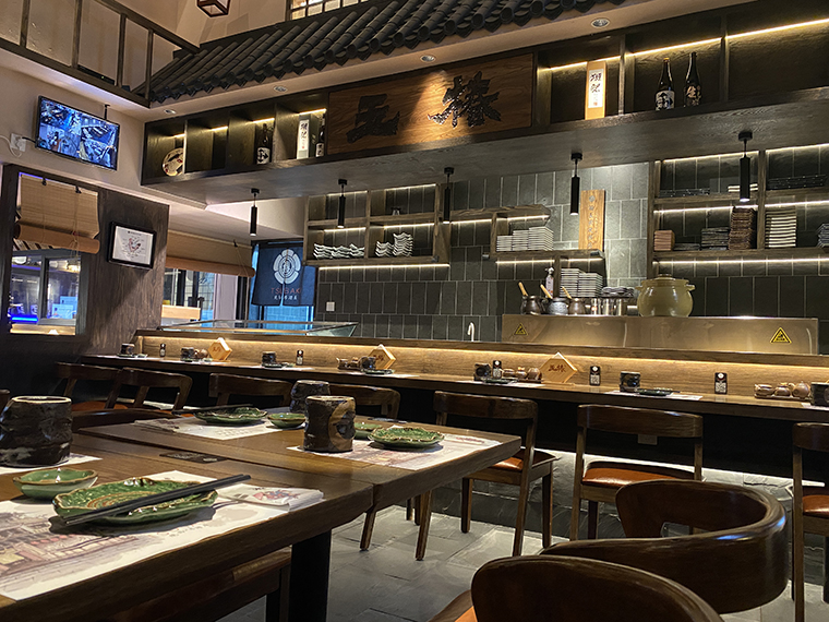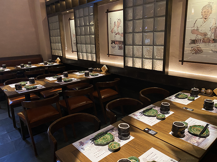 相對于其他日本料理,溫暖治愈有煙火氣的居酒屋是打開心門的神奇鑰匙。在這里,可以褪下面具,卸下防備,輕松肆意地喝酒聊天,大聲談笑,沒有職場的煩惱,沒有生活的瑣碎,有的是伴隨冰涼的鮮啤入喉部之后的片刻歡愉,有的只是一個釋放自我的放空間。居酒屋的熱鬧感,燒鳥店的煙火氣,京都老店的歷史文化魅力,是品深設(shè)計團隊重點突破的設(shè)計表達。