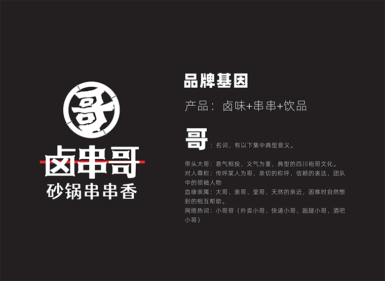 我們從鹵串哥品牌內在基因出發,提取升華了哥的文化,哥的符號。哥在四川既是表達親切信賴,尊重,也是袍哥文化,江湖義氣的表達;同時哥還是負責,擔當的意象;哥還與當下外賣小哥、快遞小哥、餐廳服務小哥的一種親切稱呼。