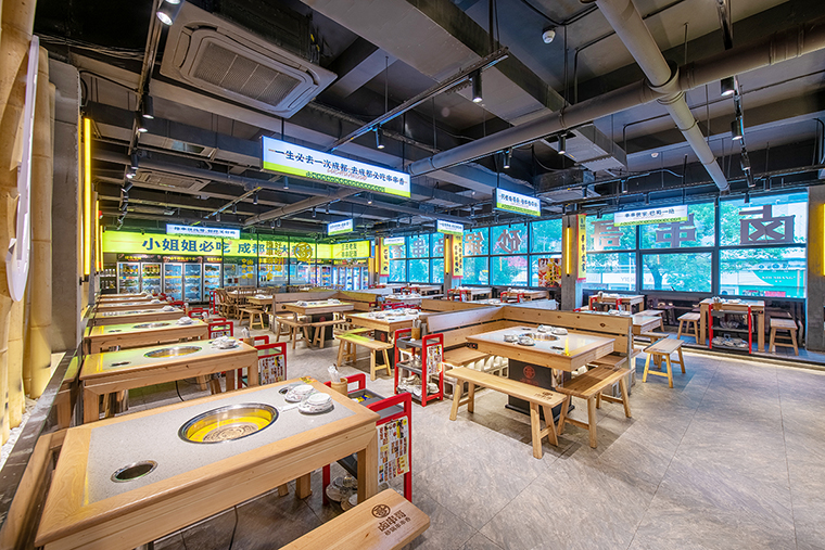3、為了表現成都串串香火鍋店的市井氣息,我們去掉了吊頂,減少立面造型,墻體使用了水泥面,還原出老成都串串香火鍋店的場景氣質,家具使用木質卡座與條凳八仙桌,竹椅,此次門店還創造性地沒有使用吊燈,僅使用軌道射燈,整個空間硬裝修造價不到800元每平方米,是后疫情時期餐飲門店裝修投資最好方向。