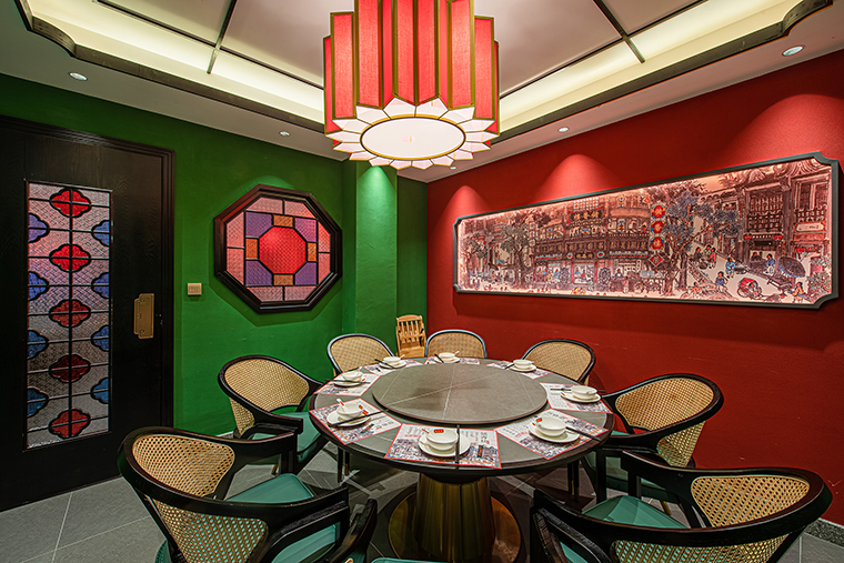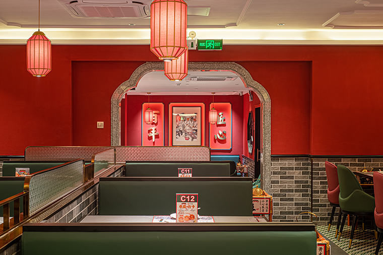 復(fù)古紅比鮮紅要暗一些,厚重些,鮮紅是新鮮食材的顏色,表達(dá)我們的核心產(chǎn)品賣點(diǎn),新鮮現(xiàn)做;紅色也是喜慶熱鬧的氛圍表達(dá),可以很好傳達(dá)粵點(diǎn)茶樓熱鬧、街坊四鄰飲茶打招呼的場(chǎng)景;